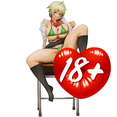 The figure faithfully captures the mood of the original illustration, featuring seductively tanned skin, a daring bikini, and the distinctive pose with contraceptives nestled between the chest and V-zone.