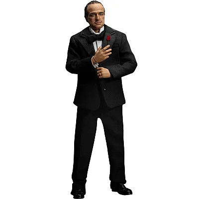 Using advanced 3D modeling and expert craftsmanship, this collectible figure faithfully recreates Vito’s most iconic look. He wears a tailored black suit made from real fabric, paired with a white shirt, black bowtie, and a red rose pinned to his chest—radiating a sense of quiet authority and elegance.