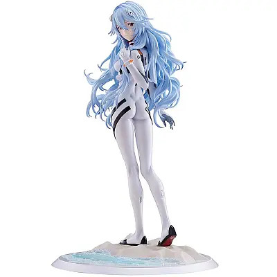 Claynel's 1/7-scale figure of Rei Ayanami from the final scene of the theatrical film "Evangelion: 3.0+1.0 Thrice Upon a Time" is back! This figure presents Rei from the final scene of the film, standing alone on the beach to see off Shinji as he heads toward a world without Eva. Her expression can be interpreted as either yearning, or contented, with the movement of her voluminous hair captured with delicate sculpting and meticulous coloring. Her base provides both ocean waves and sand. Order this unforgettable moment for your own collection today!