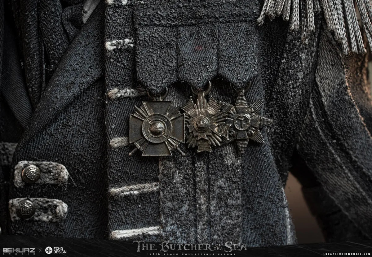 Whether it’s the tailoring details of the outfit or the special treatment of the battle damage on the cloth, or the folating ash residues along the edges of the garment, all above symbolize the shadow of the Butcher of the Sea, the represent of death.