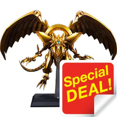 From its golden body that shines like the sun, sharp silhouette that is reminiscent of a phoenix, piercing eyes, and divine wings that surround its entire body to its sharp claws and teeth, each detail of The Winged Dragon of Ra is thoroughly recreated.