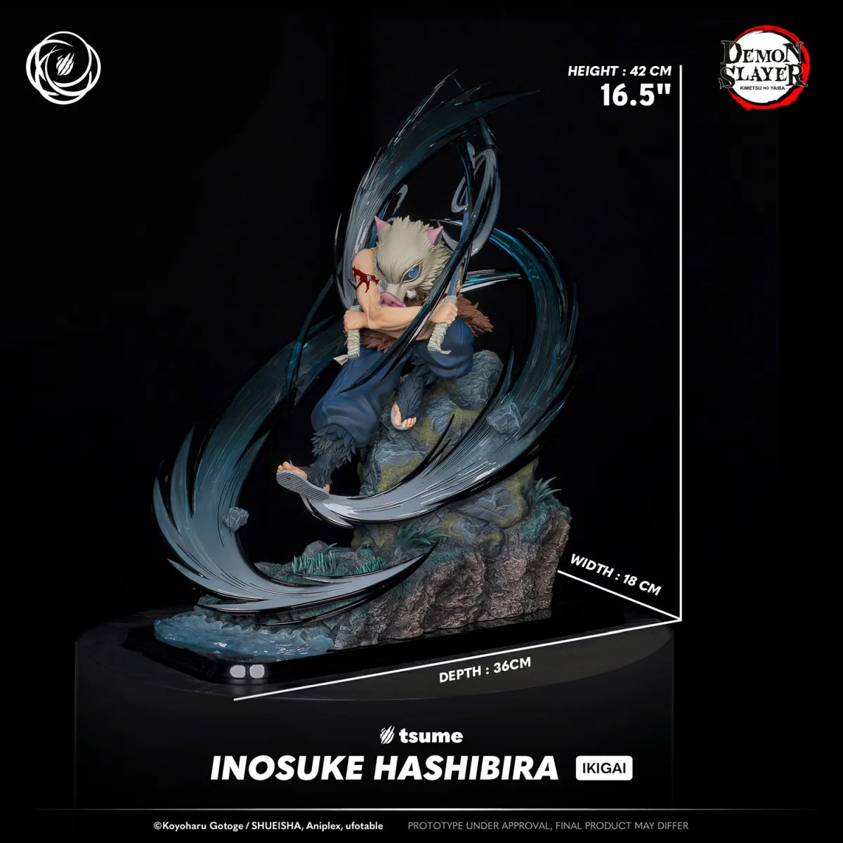 When Inosuke attacks, he doesn't just "charge": he tears through the air. INOSUKE HASHIBIRA IKIGAI captures that split second where instinct takes over: his body frozen in time, dual blades gripped tight, ready to explode forward. An iconic pose, where everything is expressed through the tension in his shoulders, his locked arms... and the primal rage contained behind the boar mask.
